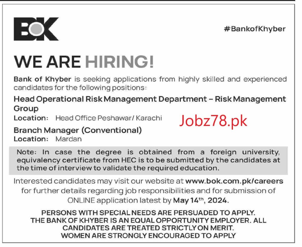 Only Male candidates can apply for this Bank of Khyber Jobs In Peshawar And Karachi 2024. Bank of Khyber is seeking applications from highly skilled and experienced candidates for the following positions: Head Operational Risk Management Department – Risk Management Group Location: Head Office Peshawar/Karachi Branch Manager (Conventional) Location: Mardan Note: In case the degree is obtained from a foreign university, equivalency certificate from HEC is to be submitted by the candidates at the time of interview to validate the required education. Interested candidates may visit our website at www.bok.com.pk/careers for further details regarding job responsibilities and for submission of an ONLINE application by May 14th, 2024.