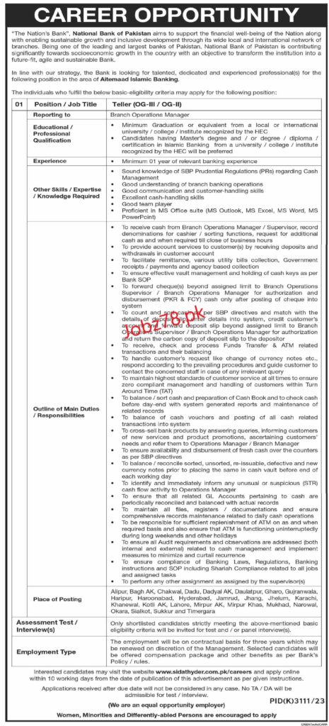 Candidates if you are seeking National Bank of Pakistan NBP Jobs May 2024 if yes. then you should try to complete this National Bank of Pakistan job because here you can easily apply for this vacancy Teller (OG-||| / OG ||).